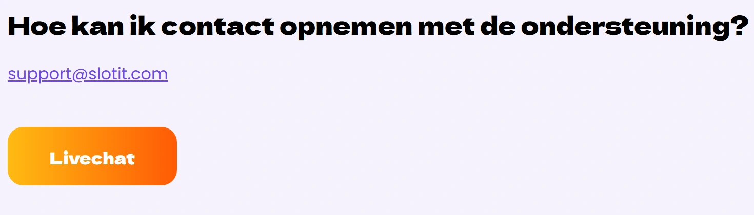 Slotit Casino biedt meertalige klantenondersteuning via verschillende kanalen. Nederlandse spelers kunnen terecht bij het supportteam via e-mail ([email protected]) of de live chat functie. Hoewel de service beschikbaar is in het Nederlands, kunnen reactietijden variëren en is niet altijd een Nederlandse medewerker beschikbaar.