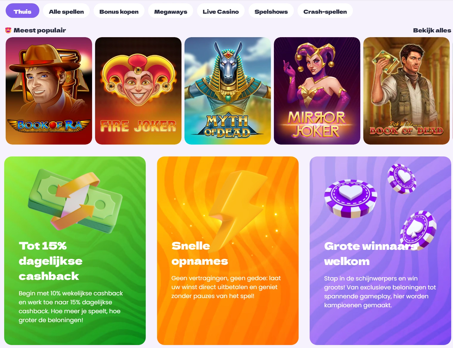 Populaire titels zijn onder andere Book of Dead, Fire Joker, Eye of Horus Megaways, Sweet Bonanza en Aviator crash-game.